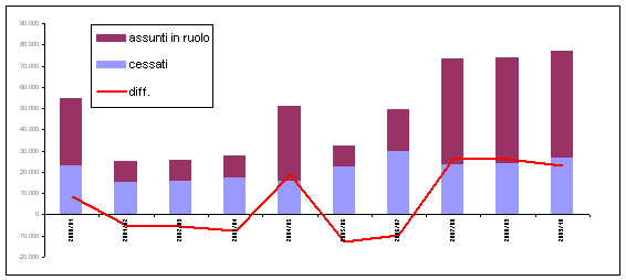 articolo 1- bis del DL 97/2004 ( convertito con modificazioni dalla legge del 4 giugno 2004, n. 143) ha previsto l'adozione - entro il 31 gennaio 2005 - di un piano pluriennale di nomine a tempo indeterminato, per il triennio 2005-2008. articolo 3 del DL n. 115/2005 ( convertito dalla legge 17 agosto 2005, n. 168). ha autorizzato assunzioni a tempo indeterminato di personale docente nonché di personale A.T.A (amministrativo, tecnico ed ausiliario), rispettivamente nel numero di 35.000 e 5.000 unità , non essendo stata la norma precedentemente citata definita in tempo utile per l'inizio dell'anno scolastico 2005-2006. DM 18 ottobre 2005, ha adottato il Piano pluriennale di assunzioni a tempo indeterminato di personale docente nel triennio scolastico 2005/2007: 35.000 già disposte per l'anno scolastico 2005/2006; 20.000 per il 2006/2007; 10.000 per il 2007/2008 |