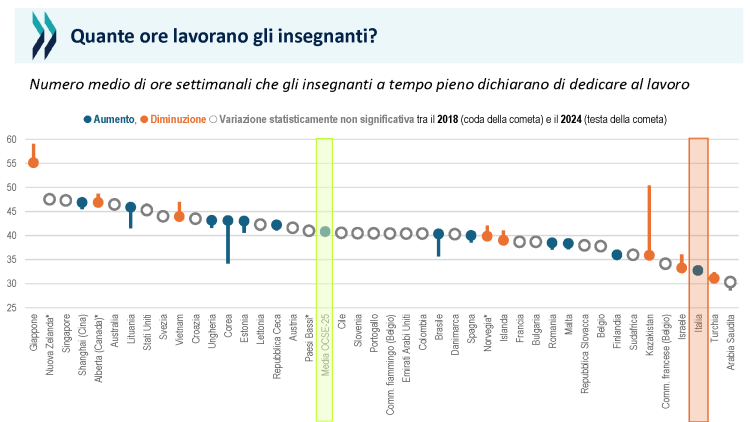 Dal punto di vista della struttura della professione ritroviamo la femminilizzazione e in maniera più accentuata l’età piuttosto alta, come si poteva prevedere, che passa dalla media OCSE di 45 ai 50 anni. In Italia ci sono anche più contratti a tempo determinato anche se, secondo la rilevazione, stanno diminuendo. Un dato per certi versi inaspettato è che gli insegnanti di seconda carriera sono più numerosi di quanto rilevato nella media OCSE.