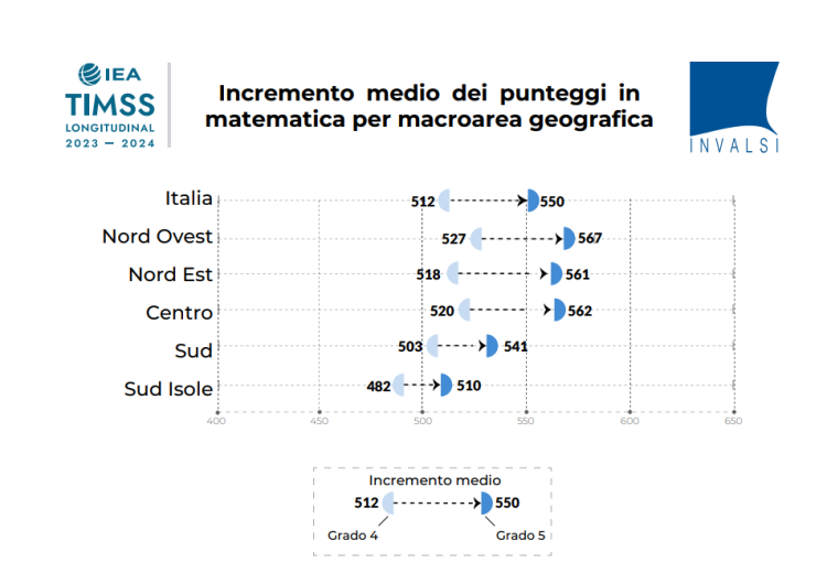 L’incremento medio in matematica per l’Italia nel 2024 per gli studenti di grado 5 è di 38 punti, solo di poco inferiore quello della Corea (40 punti) e della Slovenia (42 punti). Guardando la media dei punteggi invece quella dell’Italia (550) si colloca dietro quella della Corea (635), mentre non sono significative le differenze rispetto alla Slovenia (555) e alla Svezia (560), che ha avuto un incremento minore (parte a 30 punti). A livello di macroaree in Italia l’unica area in cui l’incremento tra i due anni non è significativo è l’area del Sud-isole (28 punti) dove la dispersione dei punteggi, e quindi l’errore standard della misura, è particolarmente accentuata. Per quanto riguarda i 4 livelli di matematica in Italia si ha la distribuzione seguente