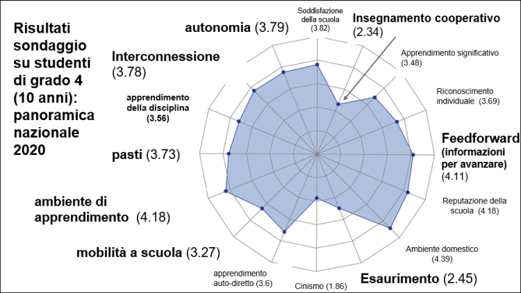 C’è anche un sondaggio volontario per gli insegnanti sulle pratiche didattiche. E questo triangola con le risposte degli studenti. E poi ci sono report di feedback generati automaticamente per ogni singolo studente e per gruppi di studenti. E l’insegnante può ottenere feedback sui risultati del proprio sondaggio. E gli studenti possono vedere i risultati. Ma, ovviamente, in seconda primaria non dirai: “Ecco il report”.